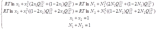 Обозначим через х мольные доли компонентов в α-фазе, а через N – мольные доли компонентов в γ-фазе, и учитывая условия нормировки их на единицу, можно систему уравнений (1.11) с учётом (1.4) и (1.7) переписать в следующем виде: