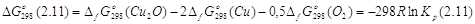 При описании равновесий с участием только оксидных фаз принято активности этих фаз считать равными единице, и для описания равновесий необходимо рассчитать только давление кислорода в газовой фазе над оксидами. В системе Cu2O – CuO – NiO оно определяется равновесием Cu2O – CuO, а в системе СuO – NiO – NiOx – NiO2 – равновесием NiO – NiO2. Для уравнений Cu2O(т)+0,5O2(г)=2CuO(т) (2.21) и NiO(т)+0,5O2(г)=NiO2(т) (2.22) давление кислорода определяется уравнениями