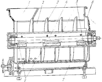 Рис. 1. вибрационная моечная машина ММКВ-2000 1 – загрузочный бункер; 2 – рабочая камера; 3 – шнек; 4 – приводной вал; 5 – грузы – дебалансы; 6 – короб; 7 сборник Примером лопастной машины служит А9-КЛА/1, предназначенная для мойки корнеплодов.