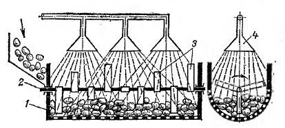 Рис. 2. Схема мытья овощей в машине с перемешивающими лопастями. 3. Барабанные овощемоечные машины В этих машинах вращается сам корпус, в который через специальные устройства загружается вода. Движение овощей осуществляется за счёт наклона барабана. Частота вращения барабана выбирается такой, чтобы каждый клубень, поднявшись по стене барабана вверх, скатывался затем вниз – т.е. совершая максимальное количество движений. По такому принципу работает моечная машина А9-КМ-2.