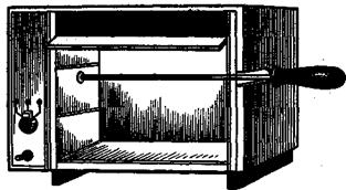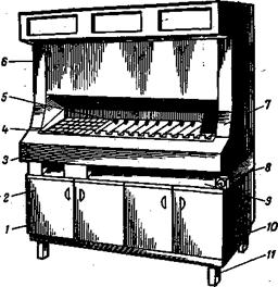 Рис. 2. Печь шашлычная ПШСМ-14: 1 – подставка с двумя инвентарными шкафами; 2 – дверцы шкафа; 3 – рабочая камера; 4 – прорези для установки шпажек; 5 – отверстие для закрепления шпажки; 6 – вытяжное устройство; 7 – горн; 8 – выключатель; 9 – зольник; 10 – сварная рама; 11 – регулирующие ножки Конвейерная печь ПКЖ предназначена для непрерывной жарки изделий из мяса (котлет, ромштексов, антрекотов) без их переворачивания. Основные узлы печи – жарочная камера, нагревательные элементы инфракрасного излучения (в кварцевых трубках), устройство для фильтрации паров, цепной транспортер, транспортирующие противни, электрооборудование. Режим работы конвейера в зависимости от вида обрабатываемых продуктов задается с помощью реле времени. Обрабатываемые продукты укладывают на предварительно смазанные противни и подают на конвейер. Соответствующими кнопками на пульте управления включают движение конвейера и нагревательные блоки по заранее заданной программе. Нагревательные элементы неравномерно распределены по всей длине печи, что в сочетании с шаговым движением конвейера обеспечивает направленный на изделие пульсирующий тепловой поток. При выходе из жарочной камеры противни с готовыми продуктами снимают с конвейера и ставят на стол раздачи. Когда из камеры поступит последний противень, кнопкой на пульте отключают нагрев. Задача Определить основные характеристики технологических машин для механической обработки продуктов: – производительность; – технологическую мощность. Дано: