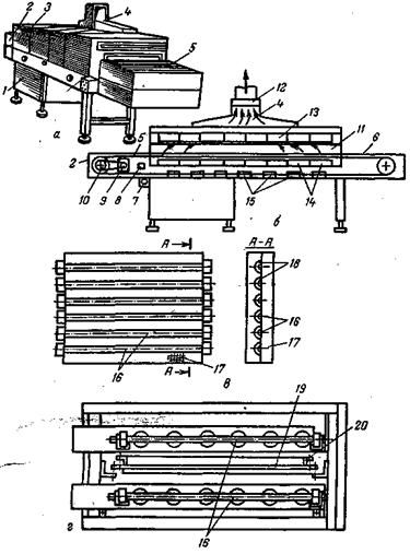 Рис. 3. Конвейерная печь ПКЖ: а – общий вид; б – схема; в-блок ИК-генераторов; г – схема поперечного разреза рабочей камеры: 1 – щит с электроаппаратурой; 2 – стол разгрузки; 3 – боковые дверцы жарочной камеры; 4 – вентиляционный короб; 5 – транспортер; 6 – стол загрузки; 7 – реле времени; 8-электродвигатель; 9 – червячный редуктор; 10 – ведущий вал цепного конвейера; 11 – жарочная камера; 12 – шиберная заслонка; 13 – блоки верхних нагревателей; 14 – блоки нижних нагревателей; 15 – штепсельные розетки; 16 – ИК-генераторы; 17 – металлическая сетка; 18 – рефлектор; 19 – функциональная емкость; 20 – ограничительные упоры машина овощ продукт обработка Список используемых источников 1. Елхина В.Д. Оборудование предприятий общественного питания Т.1. Механическое оборудование. – М.: «Экономика», 1987. 2. Кирпичников В.П., Леенсон Г.Х. Справочник механика. Общественное питание. – М.: «Экономика», 1990. 3. Беляев М.И. Оборудование предприятий общественного питания. Том 3. Тепловое оборудование. – М.: «Экономика», 1990. 4. Былинская Н.А., Леенсон Г.Х. Механическое оборудование предприятий общественного питания и торговли. – М.: «Экономика», 1980. |