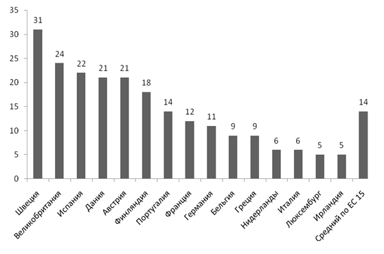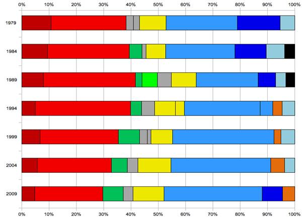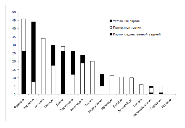 1. Коммунисты и крайне левые - Communist/Far-Left (COM,LU,EUL,EUL/NGL) 2. Социал-демократы - Social Democrats (S,SOC,PES,S&D) 3. Зеленые/региналисты - Green/Regionalist (RBW (84-89),RBW (89-94),G/EFA) 4. Зеленые - Greens only (G) 5. Либералы /центристы - Liberal/Centrist (L,LD,LDR,ERA,ELDR,ALDE) 6. Консерваторы/христианские демократы - Conservative/Christian Democrat (CD,EPP (79-92),EPP (92-99),FE,EPP-ED) 7. Консерваторы - Conservatives only (C,ED,ECR) 8. Евроскептики - Eurosceptics (EN,I-EN,EDD,IND/DEM,EFD) 9. Крайне правые националисты - Far-Right Nationalist (ER,DR,ITS) Приложение №4 График 1. Совокупная доля голосов за евроскептическую партию по странам и вид оппозиционной партии[61]