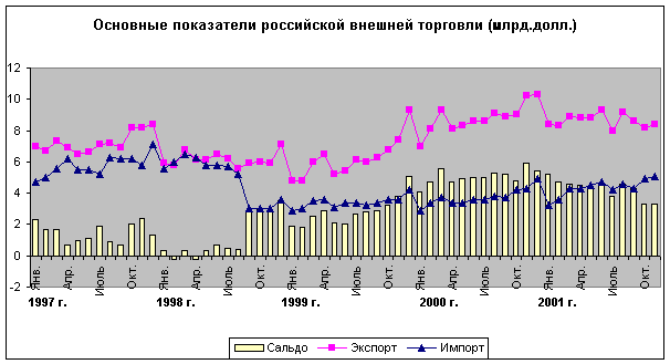 Доклад: Внешняя торговляДоклад: Внешняя торговляВ ноябре 2001 г. по сравнению с предыдущим месяцем экспорт вырос на 2,4%. Но в то же время по сравнению с уровнем годовой давности произошло заметное сокращение экспортных поставок - на 17,6%. За последние 29 месяцев это наиболее низкий показатель. В ноябре экспорт составил 8,4 млрд. долл. против 8,2 млрд. долл. в октябре и 10,2 млрд. долл. в ноябре прошлого года. Импорт в ноябре составил 5,1 млрд. долл. против 4,9 млрд. долл. в октябре и 4,3 млрд. долл. в ноябре прошлого года. Ноябрьское значение импорта является максимальным с июля 1998 г., когда этот показатель равнялся 5,7 млрд. долл. Одним из факторов продолжающегося роста импорта является повышающийся уровень жизни населения (по итогам 11 месяцев рост реальных располагаемых доходов населения, составил 6,3% по сравнению с уровнем годовой давности). Причём замедлившийся во II полугодии 2001 г. процесс укрепления реального курса рубля пока не оказал заметного влияния на динамику импорта. Cальдо торгового баланса в ноябре равнялось 3,34 млрд. долларов против 3,38 млрд. долларов в октябре и 5,84 млрд. долларов в ноябре прошлого года. Ноябрьское значение торгового баланса является минимальным с сентября 1999 г. Данные по торговому балансу за ноябрь иллюстрируют сохранение наблюдающейся в последние месяцы тенденции, а именно, плавное сокращение положительного сальдо на фоне растущего импорта и сокращающегося экспорта. Рисунок 1