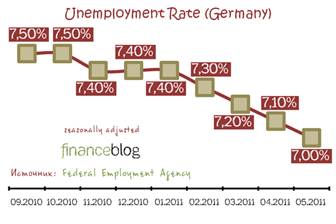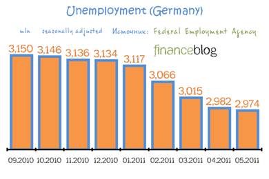 Рис.3. Динамика изменения уровня инфляции в Германии, в % [4] По предварительным данным Федерального статистического ведомства Германии, в первом полугодии 2010 года общий объем товарооборота ФРГ с зарубежными странами увеличился на 15,6% (по сравнению с соответствующим периодом прошлого года) и составил 785,8 млрд. евро (679,7 млрд. евро в первом полугодии 2009 года). При этом экспорт германских товаров увеличился на 12,9%, а импорт зарубежных товаров - на 19,1%. По данным Федерального статистического ведомства Германии, в 2010 году свыше 0,5 млн. предприятий ФРГ занимались внешнеторговыми операциями с предприятиями других стран-членов ЕС. При этом число предприятий, ориентированных на импорт (413 тыс. единиц), почти вдвое превысило число экспортирующих предприятий (219 000). Следует отметить, что на 2,0% экспортирующих предприятий приходится 83,0% всего оборота, а на 1,0% фирм, занимающихся импортом, приходится 79,0%.5 000 экспортирующих немецких фирм достигли в 2010 году оборота в размере более 10 млн. евро, а 500 предприятий - более 100 млн. евро. У импортирующих предприятий эти показатели составили соответственно 4 250 и 450 млн. евро. [7] Уже более года (с марта 2010) рынок труда Германии демонстрирует положительную динамику, показывая, что на сегодняшний день занятость населения в этой стране находится на очень высоком уровне. И ни одна крупнейшая мировая экономика на текущий момент не может похвастаться аналогичными результатами. Поэтому опубликованные сегодня новые статистические данные, показавшие дальнейшее сокращение числа безработных в Германии, абсолютно никого не удивили, так как многие участники финансового рынка уже давно привыкли к этому позитиву. Итак, Федеральное агентство занятости (Federal Employment Agency) посчитало, что количество безработных в Германии (с учетом сезонных факторов) по итогам апреля 2011 года сократилось на 8 тыс. до 2,974 млн., что является минимальным снижением за последние 5 месяцев (рис.4). При этом надо отметить тот факт, что аналитики финансового рынка, привыкшие к значительному ежемесячному снижению числа безработных в Германии, прогнозировали сокращение этого макроэкономического индикатора на 31 тыс. В тоже время итоговый результат предыдущего месяца был незначительно пересмотрен статистической службой в худшую сторону - так, в марте этого года количество безработных составило не 2,97 млн., как сообщалось месяц назад, а 2,982 млн. Но даже после такой корректировки это значение является наименьшим за последние несколько лет, что с положительной стороны характеризует рынок труда Германии. А вот такой макро-показатель, как уровень безработицы, стоит отметить отдельно. Ведь по итогам мая текущего года уровень безработицы в Германии не просто снизился, а достиг своего минимального значения за последние 20 лет (7,0%), что полностью совпало с прогнозным значением экспертов финансового рынка (рис.5).