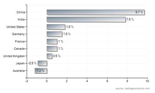 Рис.1. Рейтинг наиболее развитых стран по темпу прироста ВВП в первом квартале 2011 г. (по данным Всемирного банка) [4] По данным все того же Всемирного банка, в 2009 году Германия заняла 3-е место в мире (после США и Великобритании) по экспорту услуг, общий объем которых составил более 170 млрд. долларов США (рис.2). В некоторых отраслях (например: экспорт строительных и почтовых услуг) Германия заняла лидирующие позиции в мире. По экспорту транспортных услуг ФРГ находится на втором месте, а в таких секторах как логистика, финансовые услуги, телекоммуникации немецкие предприятия относятся к наиболее значимым экспортерам услуг. Немецкая промышленность исходит из того, что не все потенциалы роста экспорта услуг раскрыты полностью: об этом свидетельствует отрицательное сальдо в торговле услугами, а также то, что удельный вес экспорта услуг в валовом объеме экспорта составляет лишь 15,0% (в Великобритании - около 30,0%). [4]