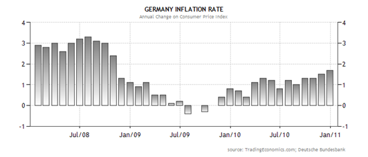 Рис.2. Динамика изменения объема экспорта товаров и услуг в Германии, в долларах США [4] По данным Федерального статистического ведомства Германии, в ноябре 2010 года индекс потребительских цен в ФРГ увеличился на 0,1% по сравнению с февралем того же года (в сравнении с предшествующим месяцем индекс не увеличился). По состоянию на 1 февраля 2011 г., уровень инфляции составил 1,7% в годовом исчислении (рис.3). Основной причиной инфляции, как и в предыдущие месяцы, является рост цен на энергоносители, без которых рост инфляции составил бы 1,1%. Наибольший вклад в рост цен внесли следующие группы товаров: газ, жидкое топливо, бензин, а также овощи (+11,1%), услуги по ремонту и содержанию жилого фонда (+4,2%), туристические поездки с предварительной оплатой расходов (+4,1%). Напротив, цены снизились на одежду и обувь (-0,9%), предметы домашнего обихода (-1,4%), телефонные услуги (-3,5%) и технику для обработки информации (-8,0%).