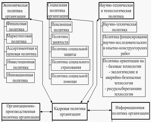 Схема 1 – Место и роль кадровой политики в политике организации Кадровая политика тесно связана со всеми областями хозяйственной политики организации. А именно, рассмотрение и принятие решений в кадровой политике происходит по всем комплексным функциональным подсистемам организации, например: управление научно-технической деятельностью, управление производством, социальная политика и т.д., что напрямую влияет на их деятельность – с одной стороны. С другой стороны, решения в области политики деятельности в этих комплексных функциональных подсистемах влияют на кадровую политику всей организации в целом. А главной целью кадровой политики организации, является обеспечение этих функциональных подсистем системы управления и производственной системы организации необходимым количеством работников, с определенными качествами. Следует учитывать, что не только организация имеет цели. Свои собственные, у каждого индивидуальные, цели имеет и каждый работник организации. Если организация рассчитывает на продолжительный и стабильный срок деятельности, то необходимо учитывать главный принцип кадровой политики – принцип соответствия индивидуальных целей работников целям организации. Он заключается в том, что одинаково необходимо достижение индивидуальных и организационных целей. Это означает, что при возникновении конфликтов нужно искать честные компромиссы, а не отдавать предпочтения целям организации. Правильное понимание сущности кадровой политики возможно лишь в том случае, если в полной мере учитывается это обстоятельство. 1.2 Содержание, задачи и принципы разработки кадровой политики Переход к рыночной экономике существенно меняет основополагающие принципы и содержание кадровой политики. В настоящее время это сознательная, целенаправленная деятельность по созданию трудового коллектива, который наилучшим образом способствовал бы совмещению целей и приоритетов предприятия и его работников. Кадровая политика за последние годы претерпела серьезные изменения и полностью согласуется со стратегией развития организации. Дефицит квалифицированной рабочей силы привел к отказу от мнения о том, что работа с кадрами носит только административный характер. Под кадровой работой в настоящее время понимается единство двух основных мер: - обеспечение подразделений организации необходимой и качественной рабочей силой; - обеспечение мотивации персонала на достижение высоких результатов трудовой деятельности. Управление персоналом стало перерастать в стратегическую функцию менеджмента организации, сохранив, однако, классические инструменты работы с кадрами: количественное и качественное планирование персонала организации, привлечение рабочей силы, повышение квалификации; кадровый контроль и т. д. Цель кадровой политики – обеспечение оптимального баланса процессов обновления и сохранения численного и качественного состава кадров в соответствии с потребностями самой организации, требованиями действующего законодательства и состоянием рынка труда. Целевая задача кадровой политики может быть решена по-разному, и выбор альтернативных вариантов достаточно широк: - увольнять работников или сохранять; если сохранять, то каким путем лучше: а) переводить на сокращенные формы занятости; б) использовать на несвой