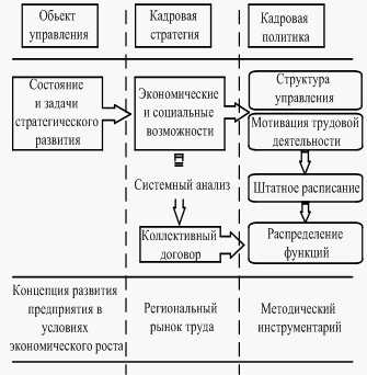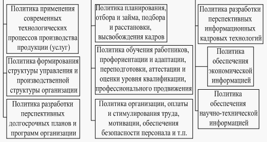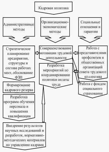 Схема 2 – Структура кадровой политики крупных промышленных предприятий 2) Подбор и расстановка персонала: - принцип соответствия – определяет необходимость соответствия объема заданий, полномочий, ответственности возможностям человека; - принцип профессиональной компетенции – определяет необходимость наличия уровня знаний, соответствующего требованиям должности;