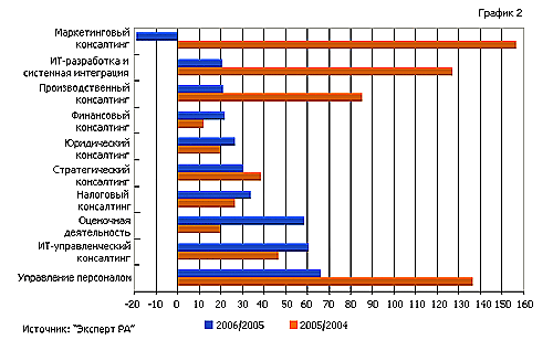 Лидирующими компаниями на отечественном рынке консалтинговых услуг в настоящее время являются PricewaterhouseCoopers, «БДО Юникон», «Интерком-Аудит», ГК «Развитие бизнес-систем», «ФинЭкспертиза», совокупная выручка каждой из которых превышает 2 млрд. рублей. Свыше половины всего объема российского рынка консалтинга приходится на долю Москвы; так из 100 крупнейших компаний 68 расположены в г.Москве. По данным рейтингового агентства «Эксперт РА», в 2008 году суммарная выручка 100 ведущих АКГ, включенных в рейтинг, составила 43 млрд. рублей, увеличившись за год лишь на 23%, тогда как в течение 2006-2007 годов рынок демонстрировал устойчивый 40%-й ежегодный прирост. Сократившийся спрос на услуги аудиторов и консультантов сегодня практически полностью закрыл возможности для механического наращивания объемов бизнеса. Согласно проведенному «Эксперт РА» опросу, около 70% аудиторско-консалтинговых компаний - участников рейтинга, с сентября 2008 года столкнулись с серьезными задержками клиентских платежей. В результате традиционно благоприятный с точки зрения расчетов по выполненным работам и заключения новых контрактов четвертый квартал 2008 года стал для аудиторов провальным. В среднем по участникам рейтинга показатель эффективности бизнеса составил 2,4 млн. рублей на человека, увеличившись по сравнению с 2007 годом более чем на четверть. Удельные доходы у компаний первой десятки рейтинга в 2008 году возросли почти на треть – до 2,8 млн. рублей/чел. Кризис в 2008 году не повлиял на структуру рынка. Соотношение доходов от аудиторских и консалтинговых практик составляет 40 к 60. Единственным сектором, который по итогам 2008 года пострадал больше других, являются услуги в области МСФО. Темпы прироста совокупной выручки ведущих АКГ от оказания услуг по международным стандартам за год снизились с 55% до 35%. В 2008-2009 годах падение мирового рынка повлекло за собой наряду с общей негативной тенденцией в экономике, увеличение спроса на консультационные услуги. Количество заказов-контрактов выросло в среднем на 25-100%. Самыми востребованными услугами становятся: разработка концепции развития компании в условиях кризиса, проекты по снижению издержек, повышению эффективности, прогноз и корректировка цены на том или ином рынке, оптимизации воспроизводственного процесса. 2.2 Приоритетные направления консультационного предпринимательства До 2008 года рынок консалтинговых услуг в России активно развивался и совершенствовался (рис. 2.2.1). Возникли новые направления консалтинга, охватывающие деятельность как мелких и средних предприятий, так и крупных компаний. Консультирование применяется фирмами для решения задач, обусловленных особенностями рыночной проблематики, спецификой конкретных фирм, их ресурсами и целями.