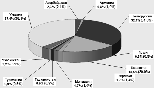 Рисунок 1 – Географическая структура торговли России со странами СНГ в 2008 году (2007 год) (в % от общего объема товарооборота со странами СНГ). Крупнейшим экономическим партнером на протяжении многих лет остается Украина, доля которой в товарообороте России со странами СНГ в 2008 году составила 37,4%. Также основными торговыми партнерами России среди стран СНГ являются Белоруссия и Казахстан. На их долю в 2008 году приходилось более половины российского товарооборота со странами СНГ (соответственно – 32,1% и 18,5%). В целом структура внешней торговли России со странами СНГ, в отличие от торговли с ЕС (основным торговым партнером), носит более рациональный характер. Хотя объем торговли России с Евросоюзом в целом существенно превышает товарооборот со странами СНГ, по отдельным товарам рынки стран Содружества более значимы. Так, наряду с продукцией ТЭКа (около 47% общего объема российского экспорта в СНГ), важными экспортными позициями являются поставки машинно-технической продукции в страны СНГ (18%) - по стоимости они в три раза превышают объемы экспорта аналогичной продукции в Евросоюз. Начиная с четвертого квартала 2008 года кризис стал оказывать сильное негативное влияние на состояние взаимной торговли. Анализ помесячной динамики в последнем квартале прошедшего года и за два месяца 2009 года свидетельствует о значительном замедлении темпов роста экспорта и импорта России с государствами Содружества, наблюдается падение товарооборота фактически на 50 процентов. Важной составляющей торгово-экономических отношений России со странами СНГ и показателем эффективности интеграционных процессов является инвестиционное сотрудничество. Объем накопленных российских инвестиций в странах СНГ на конец 2008 года превысил 4,0 млрд. долл. США, а объем накопленных инвестиций стран СНГ в экономику России составил около 1,8 млрд. долл. США. Российский бизнес занимает довольно значительные позиции на пространстве Содружества. Российская Федерация входит в десятку крупнейших инвесторов Армении, Азербайджана, Белоруссии, Казахстана, Молдавии, Таджикистана и Украины. Более 4 тысяч предприятий в странах СНГ с участием российского капитала действуют в различных сферах производства, банковском секторе, торговле и сфере услуг, транспорте, строительстве, агропромышленном комплексе. Российские компании задействованы в реализации крупных проектов в нефтегазовой, металлургической, химической и пищевой промышленности стран Содружества, в производстве строительных материалов, они активно присутствуют на рекламном рынках. Телекоммуникационные компании работают в Армении, Белоруссии, Казахстане, Таджикистане, Туркмении, Узбекистане и Украине. Серьезные инвестиции сосредоточены в банковской сфере. Важным направлением экономического сотрудничества России со странами СНГ продолжает оставаться развитие производственных кооперационных связей между предприятиями и технологически взаимосвязанными производствами. Для таких отраслей промышленности как машиностроение, металлургия и некоторых других, в которых поставки по кооперации занимают значительный удельный вес, поддержание кооперации критически необходимо для разработки, производства и реализации продукции. Таблица 1 - Инвестиции из России в страны СНГ (январь-декабрь 2008 года) (тыс. долл. США)