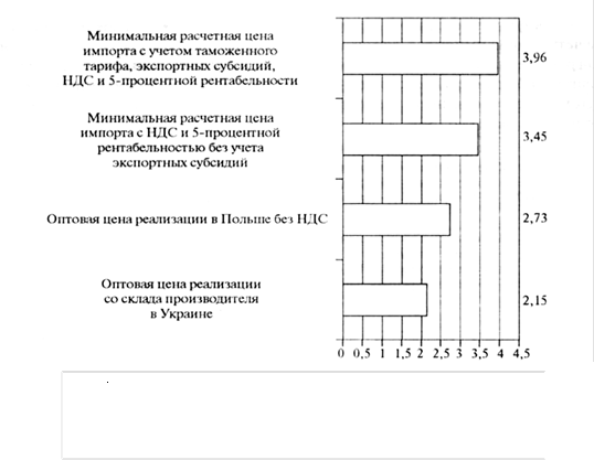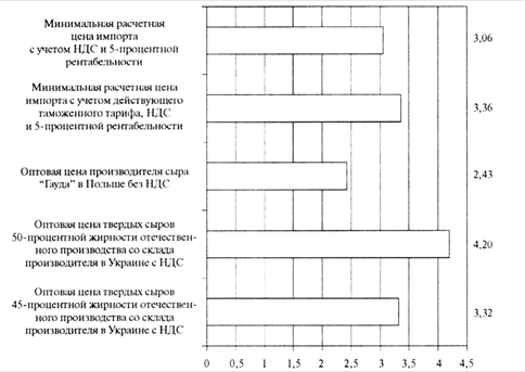 Рис. 6. Оценка ценовой конкурентоспособности твердых сыров отечественного производства относительно потенциального импорта из Польши в январе 2010 г. (евро за 1 кг). На рисунке 6 приведены результаты расчетов ценовой конкурентоспособности твердых сыров при действующем таможенном тарифе и при условии нулевой ставки пошлины. Аналогичные расчеты по состоянию на сентябрь 2009 г. показали, что по цене твердые сыры украинского производства были бы конкурентоспособны и при нулевой ставке импортной пошлины. Однако вследствие резкого подорожания твердых сыров отечественного производства их цена практически сравнялась с ценой импортируемых польских сыров. Если же в условиях ЗСТ не будет сделано исключение для твердых сыров, то этот продукт украинского производства проиграет ценовую конкуренцию импортируемому (станет на 8% дороже). Выводы и рекомендации Для чувствительных товаров агропродовольственной группы целесообразно установить исключения из ЗСТ - тем более, что ЕС применяет импортные квоты на большинство из этих товаров и защищает свои рынки другими нетарифными барьерами. В ходе переговоров о ЗСТ целесообразно также добиваться отмены субсидирования экспорта в Украину со стороны ЕС - с тем, чтобы обеспечить справедливые условия конкуренции. Анализ ценовой конкурентоспособности товаров мясной группы отечественного производства обосновывает целесообразность установления исключения из ЗСТ для свинины и мяса птицы. Проведенные расчеты ценовой конкурентоспособности молочных товаров на внутреннем рынке Украины показали, что вследствие резкого роста цен на отечественные молочные продукты в последние месяцы 2009 г. и в начале 2010 г. они утратили ценовую конкурентоспособность относительно потенциального импорта из стран ЕС. Таким образом, в ходе переговоров о ЗСТ целесообразно добиваться отмены экспортных субсидий на товары агропродовольственной группы со стороны ЕС и установления исключения из ЗСТ для сливочного масла, СОМ, твердых сыров. Из общих рекомендаций по результатам проведенного исследования можно выделить такие: необходимо принять и обеспечить финансирование государственной программы поддержки животноводства, а особенно - тех его отраслей, которые подвергаются значительным рискам в условиях ВТО и ЗСТ; целесообразно ввести систему мониторинга агропродовольственного рынка, ведь в условиях роста открытости экономики и волатильности цен на продукцию сельского хозяйства от этого зависит эффективность мер государственного регулирования. Следовательно, дальнейшее снижение или полная отмена импортных тарифов на мясо-молочную продукцию будут иметь негативное влияние на ценовую конкурентоспособность отечественных продовольственных товаров этой группы на внутреннем рынке. Соответственно, состояние мясо-молочной отрасли и мясомолочного рынка страны будет определяться в зависимости от условий ЗСТ. Использованы источники 1. World Tariff Profiles 2009. Printed by WTO Secreteriat (http://www.wto.org/englisli/res_e/ bookspjVtariiT_profiles09_e. pdf). 2010, p.78, 165. 2. Draft general budget 2010. Agriculture and rural development (http://www.eur-lex. europa. eu/ budget/data/P2010_VOL4/ EN/nmc-titleN123A5/index.html). 3. Report of the Wforking Party on the accession of Ukraine to the World Trade Organization. WT/ACC/UKR/152.25 January 2008 (http://www.wto.org). 4. World Tariff Profiles 2009, p.187. 5. WTO document G/TBT/GEN/74/Rev.2 (http://www.wto.org/english/ news_e/news 09_е/ tbt_25jun09_agenda_e. doc).2 липня 2009 p. 6. Ст.3.1 Регламенту ЄК № 853/2004 (http://www.eur-lex. europa. eu/.? uri= OJ: L