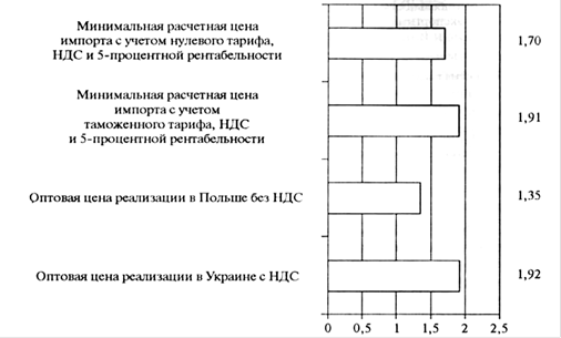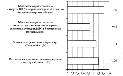 Рис. 2. Оценка ценовой конкурентоспособности свинины отечественного производства относительно потенциального импорта из Польши в январе 2010 г. (евро за 1 кг) 4. Ценовая конкурентоспособность мяса птицы С 20 июля 2008 г. в ЕС действует ставка субсидирования экспорта мяса птицы для мороженых куриных тушек в размере 55 евро за 100 кг при поставках в страны СНГ. В результате польские импортеры имеют ценовое преимущество в сегменте замороженного мяса птицы: минимальная расчетная цена на импортное мясо на 28% ниже, чем на отечественное (рис.3). Расчеты ценовой конкурентоспособности показывают, что на внутреннем рынке украинский производитель имел бы преимущества в цене, если бы в ЕС экспорт не субсидировался. Тогда минимальная (при условии 5-процентной рентабельности) расчетная цена импорта с таможенным тарифом (15% - на свежие и охлажденные тушки и 12% - на замороженные; импортируются преимущественно замороженные) и НДС превысила бы оптовую цену отечественного производителя на 17%. Между тем при нулевой ставке пошлины и при условии отсутствия экспортных субсидий польская птица была бы на 35% дешевле. Следовательно, хотя после девальвации гривни в условиях финансового кризиса курятина отечественного производства получила конкурентные преимущества перед импортируемой из ЕС, все же наличие в ЕС экспортных субсидий не позволяет их реализовать. В случае же отмены таких субсидий украинский производитель сможет реализовать свои конкурентные преимущества на этом рынке. Между тем при условии нулевой ставки ввозной пошлины и отмены экспортных субсидий он проиграет ценовую конкуренцию.