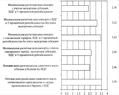 Рис. 3. Оценка ценовой конкурентоспособности мяса птицы отечественного производства относительно потенциального импорта из Польши в январе 2010 г. (евро за 1 кг) 5. Ценовая конкурентоспособность сливочного маслаС 20 марта 2009 г. ЕС возобновил экспортные субсидии на молоко и молочные продукты. Экспорт сливочного масла в блоках весом свыше 20 кг субсидируется на уровне 60 евро за 100 кг. На рисунке 4 приведены результаты расчетов ценовой конкурентоспособности сливочного масла при действующем таможенном тарифе, при условии нулевой ставки пошлины, а также с учетом экспортных субсидий и без них. Аналогичные расчеты, произведенные в сентябре 2009 г., показали, что конкурентоспособность польского сливочного масла на рынке Украины поддерживалась за счет экспортных субсидий. Без их учета сливочное масло отечественного производства было бы на 12% дешевле, чем потенциально импортируемое из Польши. Даже при нулевой ставке ввозной пошлины цена отечественного товара могла бы быть на 2% ниже. Однако с сентября 2009 г. по январь 2010 г. сливочное масло в блоках со склада украинского производителя подорожало на 36,5%, тогда как сливочное масло в блоках от польского производителя - на 19,3%. Как следствие, сливочное масло отечественного производителя еще больше утратило конкурентные позиции. С учетом экспортных субсидий и действующей ставки таможенного тарифа цена сливочного масла от украинского производителя на 26% превышает цену его потенциального импорта из Польши. Если же при формировании ЗСТ будет установлена нулевая ставка ввозной пошлины, то разница в ценах достигнет 32%. Даже при условии отмены экспортных субсидий разница в ценах составит 11 %. Если же эти субсидии будут отменены, а пошлина оставлена без изменений, то позиции отечественного производителя почти сравняются с позициями импортера. Следовательно, установление нулевой ставки пошлины на сливочное масло создало бы риски для отечественных производителей даже при условии отмены экспортных субсидий.
