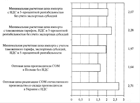 Рис. 4. Оценка ценовой конкурентоспособности сливочного масла отечественного производства относительно потенциального импорта из Польши в январе 2010 г. (евро за 1 кг). 6. Ценовая конкурентоспособность СОМЭтот продукт субсидируется в ЕС на уровне 22 евро за 100 кг. На рисунке 5 приведены результаты расчетов его ценовой конкурентоспособности при действующем таможенном тарифе (10%), при условии нулевой ставки импортной пошлины, а также с учетом экспортных субсидий.