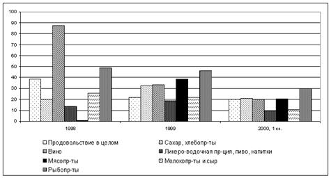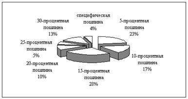 Текущие таможенные процедуры регулируются Таможенным кодексом, принятым в 1993 г. и скорректированным в 1995 г. В настоящее время обсуждается новый Таможенный кодекс, который нацелен на установление боле прозрачных процедур прохождения таможни в России. Рис. 3. Результаты государственного контроля исполнения национальных стандартов и правил обязательного сертифицирования (в % запрещенной к реализации продукции в объеме проверенной продукции)