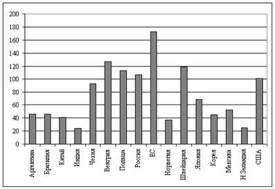 1 К странам с переходной экономикой относятся Болгария, Эстония, Латвия, Румыния, Словакия и Словения, являющиеся членами ВТО, а также не входящие в состав ВТО страны: Албания, Беларусь, Грузия, Казахстан, Литва, Россия, Украина. К развивающимся экономикам относятся Аргентина, Бразилия, Чили, Индия и Южная Африка, являющиеся членами ВТО, а также Китай, не входящий в состав ВТО. В соответствии с требованиями ВТО Россия должна принять на себя обязательства по связыванию тарифных ставок, то есть зафиксировать первоначальный уровень связывания тарифов, выше которого она обязуется не поднимать ставки ввозных пошлин, и конечный уровень связывания тарифов, который будет достигнут в конце имплементационного периода. Первоначальные предложения России на переговорах по присоединению к ВТО предполагали средневзвешенную ставку начального уровня связывания таможенных тарифов в размере 48% и ставку конечного уровня связывания – 37%. Нетрудно заметить, что выдвинутые Россией на обсуждение связанные ставки тарифов превышают действующие. Это вызвано тем, что в условиях низких по сравнению с другими членами ВТО таможенных пошлин Россия стремится их повысить до уровня, существующего в других странах. Придерживаясь такой тактики, Россия стремится получить сопоставимый с этими странами уровень таможенной защиты. Однако страны-члены ВТО настаивают на действующих ставках (около 14%), а также их дальнейшем сокращении в среднем на 36% в течение имплементационного периода. При определении максимально возможных пределов снижения ставок ввозных таможенных пошлин Россия должна применять дифференцированный подход – в наибольшей степени подвергаются сокращению менее чувствительные группы, по которым объем импорта незначителен. К нечувствительным товарам можно отнести живых животных, продукты животного происхождения, живые деревья и другие растения, растительные соки и экстракты, растительные материалы для изготовления плетеных изделий и прочие продукты растительного происхождения. Минимальному снижению таможенных тарифов подвергнутся наиболее чувствительные группы товаров, например, мясо и пищевые мясные субпродукты, сахар, растительное масло, вино, спирт. Соглашения ГАТТ не содержат каких-либо положений относительно тарифной эскалации. Получившее в России распространение это явление может быть использовано для регулирования тарифного протекционизма переработанной продукции с помощью вариации тарифов на сырье. Чтобы обеспечить требования Соглашения по минимальному доступу, применяется система двуставочного квотированного тарифа. Среди основных видов продовольствия доля импорта картофеля, а также яиц и яйцепродуктов не превышает 5% от их внутреннего потребления. Согласно этому требованию Россию будет вынуждена повысить степень либерализации этих продуктов. Как и многие страны, в ходе переговоров с ВТО Россия стремится добиться разрешения на использование тарифной квоты (что очень необходимо для регулирования импортных поставок сахара и сахара-сырца) и специальных защитных мер, которые позволят избежать массового наплыва импорта и установление поставщиками импортной продукции демпинговых цен на российском рынке. Сейчас представители некоторых подотраслей пищевой промышленности, где влияние импорта еще довольно значим