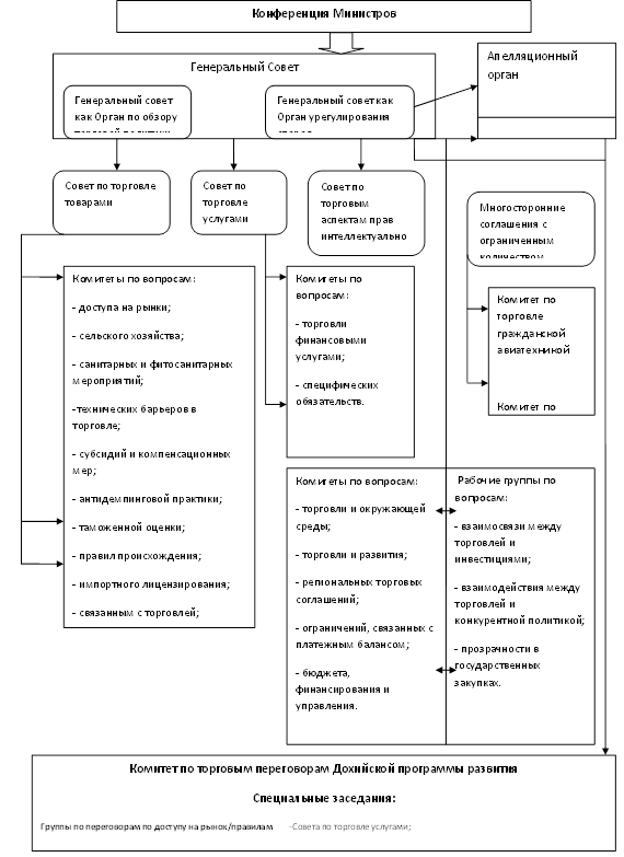 Рисунок 1. Структура Всемирной торговой организации 1.3 Сфера деятельности и функции ВТО Сфера деятельности ВТО ВТО призвана регулировать торгово-политические отношения участников Организации на основе пакета Cоглашений Уругвайского раунда многосторонних торговых переговоров (1986-1994 гг.). Соглашение об учреждении ВТО предусматривает создание постоянно действующего форума стран-членов для урегулирования проблем, оказывающих влияние на их многосторонние торговые отношения, и контроля за реализацией соглашений и договоренностей Уругвайского раунда. ВТО функционирует во многом так же, как и ГАТТ, но при этом осуществляет контроль за более широким спектром торговых соглашений (включая торговлю услугами и вопросы торговых аспектов прав интеллектуальной собственности) и имеет гораздо большие полномочия в связи с совершенствованием процедур принятия решений и их выполнения членами организации. Неотъемлемой частью ВТО является уникальный механизм разрешения торговых споров. Страны-члены ВТО взаимодействуют в рамках недискриминационной торговой системы, где каждая страна получает гарантии справедливого и последовательного отношения к ее экспорту на рынках других стран, обязуясь обеспечивать такие же условия для импорта на свой собственный рынок. В выполнении обязательств развивающимися странами предусмотрены сравнительно большая гибкость и свобода действий. Основные правила и принципы ВТО отражены в многосторонних торговых соглашениях, которые затрагивают торговлю товарами и услугами, а также торговые аспекты прав интеллектуальной собственности, разрешение споров и механизм обзора торговой политики. За прошедшие годы определились приоритетные направления деятельности ВТО. В области торговли товарами это: - доступ на рынки (тарифные и нетарифные барьеры); - реализация правила ВТО по таким специфическим товарам, как сельскохозяйственная продукция, текстиль и одежда; - правила в отношении использования антидемпинговых пошлин, субсидий, защитных мер, технических барьеров в торговле, санитарных и фитосанитарных мер; - импортное лицензирование и процедуры импортного лицензирования. Все сказанное выше относится и к этому направлению деятельности ВТО. Функции ВТО Главная задача ВТО – содействовать беспрепятственной международной торговле. Развитые страны, по инициативе которых создана ВТО, полагают, что именно экономическая свобода в международной торговле способствует экономическому росту и повышению экономического благосостояния людей. 1. ВТО содействует выполнению, администрированию и реализации положений многосторонних торговых соглашений, а также является механизмом для выполнения, администрирования и реализации положений торговых соглашений многостороннего характера. 2. ВТО обеспечивает проведение переговоров между ее членами относительно их торговых взаимоотношений по вопросам, урегулированным соглашениями. По решению Конференции министров ВТО может обеспечивать проведение переговоров между ее членами по иным вопросам, а также создавать организационный механизм для юридического оформления результатов таких переговоров. 3. ВТО администрирует понимание о правилах и процедурах относительно урегулирования споров, описанное в приложении 2 к Марракешскому соглашению. 4. ВТО администрирует