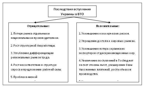 Рисунок 2. Положительные и отрицательные последствия вступления в ВТО для Украины Эксперты прогнозируют, что положительные последствия вступления Украины в ВТО ожидают области самолетостроения, судостроения, химическую промышленность, сельское хозяйство, сферы риэлторсих услуг, образования морского транспорта и медицинских услуг. Также это приведет к положительным последствиям в сфере легкой и пищевой промышленности, сфере телекоммуникаций, туристических услуг, на фондовых биржах, трубопроводном транспорте, сфере страхования, почтовой связи и банковских услуг. Членство в ВТО будет означать внедрение прозрачных и одинаковых для всех участников рынка условий хозяйственной деятельности и конкуренции. Это, безусловно, приведет к росту деловой активности и росту иностранных инвестиций. Как свидетельствует опыт стран Центральной Европы, рост иностранных инвестиций после вступления в ВТО составляет от 50% до 200%. Министерство экономики Украины прогнозирует приток инвестиций в размере 3 млрд. долларов. Членами ВТО являются 152 государства, доля которых в мировой торговле составляет 96%. Став членом этой организации, Украина получит лучшие условия доступа на рынки стран - членов ВТО, вследствие уменьшения тарифных и нетарифных ограничений, что, несомненно, будет содействовать росту экспорта. По мнению экспертов, после вступления Украины в ВТО объем отечественного экспорта увеличится на 1 млрд. дол. США. По расчетам Министерства Экономики Украины, чрезвычайного увеличения импорта товаров вследствие вступления Украины в ВТО не состоится. Причина состоит в особенностях внутреннего рынка Украины, который еще недостаточно развит для поглощения больших объемов импорта. Минэкономики имеет прогнозные расчеты изменений объемов импорта с учетом обязательств, взятых на себя Украиной в рамках переговорного процесса по вступлению в ВТО по отдельным товарным группам: - средняя ставка таможенной пошлины на продукцию легкой промышленности, соответственно тарифному положению Украины, может быть уменьшена с 6,35 до 5,97 %. Объемы импорта этой области возрастут с 660 до 750 млн. дол. США, или на 14 %; - в металлургии можно ожидать уменьшение ставки ввозной пошлины до "нулевой". В результате импорт увеличится с 1,2 до 1,4 млрд. дол. США, или на 16 %; - ставки таможенной пошлины на продукцию химической промышленности Украина предполагает уменьшить с 6,39 % до 5,73 %. Ожидается, что за переходный период объем импорта этой продукции возрастет с 1,7 до 1,9 млрд. дол. США, или на 11,5 %; - соответственно тарифному предложению предполагается уменьшение ставки ввозной пошлины на сельскохозяйственную продукцию с 20,96 до 12,53 %, а увеличение импорта этой продукции в Украину не превысит 7 -8 %. В данном случае важно, что на сегодняшний день отечественная продукция занимает 93 % рынка продуктов питания Украины. Такая ситуация не является типичной - на рынках других стран их отечественная продукция составляет 60 -70 %, остальное - импорт. В целом средневзвешенная ставка действующего таможенного тарифа составляет 7,02 %, а снизить ее предлагается до 5,66%. Однако, следует подчеркнуть, что снижение импортных тарифов приведет к обострению конкуренции на внутреннем рынке между украинскими и зарубежными производителями. Со вступлением Украины во Всемирную торговую организацию украинские компани