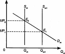 Рис.1 Изменения денежной массы оказывают существенное краткосрочное воздействие на номинальный ВНП. По мнению кейнсианской школы, это воздействие осуществляется опосредованно, через трансмиссионный (передаточный) механизм: а) сначала происходит изменение S m; б) это изменение воздействует на изменение процентной ставки; в) последнее влияет на объем инвестиций; г) автономный сдвиг в инвестициях мультиплицируется в изменении AD; д) происходит изменение в номинальном ВНП. Этот многоступенчатый механизм включает и взаимодействие кривой неизменяющегося денежного спроса с изменением в денежной массе. Эту кривую называют графиком предпочтения ликвидности. Изменение в Q m ведет к изменению процентной ставки и Т.д. через весь трансмиссионный механизм. Краткосрочные финансовые активы менее подвержены риску изменений ставки процента, чем долгосрочные активы. Иными словами, независимо от изменений условий краткосрочные финансовые активы могут быть быстро проданы практически по той же цене, по какой они покупались. Если по различным активам предполагается одна и та же норма отдачи, большинство владельцев активов предпочтут актив с высшей степенью ликвидности. Это предпочтение активов с низкой степенью риска и называется их предпочтением ликвидности. Предпочитая ликвидность, инвесторы хотят получать более высокую норму отдачи на менее ликвидные активы. Предпочтение ликвидности может быть выражено как премия ликвидности, добавленная к долгосрочной процентной ставке сверх ставки по краткосрочным активам. Премия ликвидности — разница между долгосрочными и краткосрочными ставками процента, который хочет получить владелец долгосрочных активов в обмен на потерю ликвидности. Премия ликвидности — причина, по которой краткосрочные ставки ниже долгосрочных. Если Q m растет, то население, в соответствии с теорией предпочтения ликвидности, предпочтет покупать активы с более высокой ставкой процента, например облигации с фиксированным доходом. Цена облигации тоже начнет расти, влияя на снижение ставки процента в экономике. Это снижение произойдет по следующей причине. Допустим, мы купим одну облигацию, по которой за год платится ставка в 50% (250 р.) за 500 р. Спрос на облигации вызовет рост цен на них, например, до 1 тыс. р. Но она по-прежнему приносит каждый год 250 р., что теперь составляет не 50%, а 25%. То есть когда цена актива с фиксированным доходом растет, ставка процента на него снижается. Что это означает для кривой предпочтения ликвидности? Когда S m увеличивается, население расходует избыточные деньги на покупку облигаций. Ставка процента снижается по мере того, как цена активов с фиксированными доходами растет. Ставка процента существенно воздействует на величину инвестиционного спроса. Принимая инвестиционные решения, фирмы рассчитывают норму отдачи всех инвестиционных проектов, ранжируют их по норме отдачи от высшей к низшей и отсекают от рассмотрения все проекты, которые имеют норму отдачи ниже ставки процента. Когда ставка растет, этот барьер проходит все меньшее число проектов. Снижение инвестиционных расходов мультиплицируется на совокупный спрос, который сократится, вызывая рецессию. Но если ставка процента снижается, а инвестиции увеличиваются, то AD растет, что ведет к одновременному повышению ценового уровня и реальн
