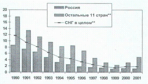 Таблица 2. Доля дальнего зарубежья в экспорте стран СНГ (в % к общему объему их экспорта) [6, стр. 135].