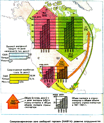 Устранение таможенных барьеров, предусмотренных подписанием НАФТА (в течение 10 лет предполагается полностью снять тарифные ограничения на торговлю товарами легкой промышленности, машинами и запасными частями к ним; 57% таможенных тарифов, ранее действовавших в торговле сельскохозяйственной продукцией устраняются с 1 января 1994 г., через 15 лет на всю номенклатуру продукции аграрного сектора) увеличит объемы взаимной торговли и будет способствовать превращению региона в мощный экономический центр, аналогичный интеграции в Западной Европе. Подписание соглашения закрепило существующие тенденции торговых отношений в регионе - за 1987-1993 гг. торговый оборот между США и Канадой увеличился на 50%, а между США и Мексикой практически удвоился. Ожидается, что создание зоны свободной торговли повлечет за собой миграцию капиталов и рабочей силы из США и Канады в Мексику, особенно в трудоемкие отрасли - текстильную промышленность и производство игрушек, что приведет к росту числа высококвалифицированных рабочих мест в этой стране, экономика которой, как ожидается, в наибольшей степени выиграет от участия в НАФТА. Новый импульс развития получит приграничная зона между США и Мексикой. Рост экспорта из США потребует создания новых рабочих мест в высокотехнологичных отраслях, а также в банковском деле и сфере услуг (по оценке в США будет создано 171 тыс. новых рабочих мест). За счет участия США в НАФТА в 90-е гг. ожидается рост ВВП на 15 млрд. долл. в год. Международная интеграция в развивающихся регионах мира, как правило не выходит за рамки создания зон свободной торговли. Уровень развития интеграционных объединений
