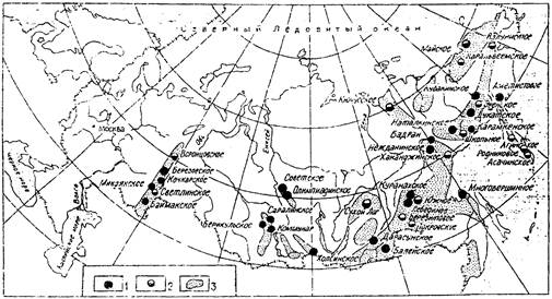 Несмотря на некоторое снижение добычи золота в 1994-1995 гг. его потребление постоянно возрастает в связи с увеличением использования ювелирной промышленностью, электроникой и тезоврационным накоплением. Снижение цен на золото объясняется крупными продажами золота Центральными банками ряда стран и валютно-финансовым кризисом в странах Азиатско-Тихоокеанского региона - крупнейших покупателей золота. Таким образом, золото потеряло свою роль в качестве мировых денег. Но изменение его рыночной стоимости продолжает существенно влиять на курсы валют многих стран, на цены товаров и экспорт многих мировых держав и в том числе России, на состояние горнодобывающей и других отраслей промышленности, в том числе золотодобывающей. Уменьшение стоимости золота снижает рентабельность его добычи, несет уменьшение доходов от экспорта, повышение импорта зарубежных ювелирных изделий и способствует сокращению собственной ювелирной промышленности. Возрастание спроса на золото, которое в ближайшей перспективе будет продолжаться, требует дальнейшего увеличения его добычи. В настоящее время по добыче золота Россия занимает шестое место после ЮАР (522 т), США (329 т), Австралии (250 т), Канады (150 т), Китая (127 т), Россия (125т). Золотой запас России к 1915 г. составлял 1338 т. Несмотря на все потрясения Первой мировой войны, революции и вызванные ими потери большого количества золотого запаса к 1953 г. он составлял 2050 т. Однако в последующие годы он начал быстро убывать, и к 1991 г. золотой запас России сократился до 240 т. В последние годы он начал постепенно возрастать: в 1993 г. - 308 т.; в 1996 г.-380 т., а к апрелю 1998 г. достиг 526 т. Основными поставщиками золота являются россыпные и коренные месторождения, (рис. 1.2). Размещение основных месторождений золота России Рис. 1.2