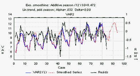 (фактический ряд) (выравненный ряд) (остаточный ряд) Рис. 3. График результатов экспоненциального сглаживания Таблица 4 Прогнозируемый объем продаж напитка “Тархун” в 2000 г.