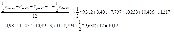 3) рассчитать индекс сезонности для июня 1997 г. как отношение объема продаж в июне 1997 г. к среднему объему за месяц в течение исследуемого периода:
