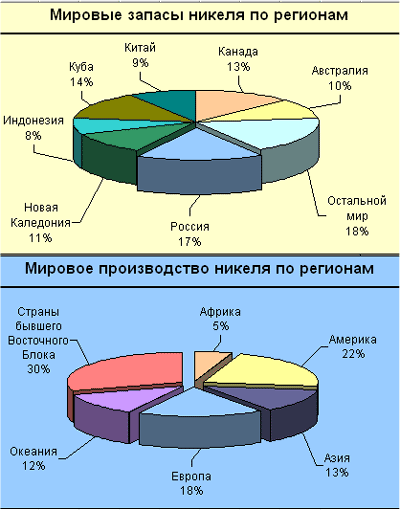 В Канаде, России, Китае и ЮАР от 90 до 100% никеля заключено в