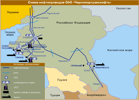 Рис 1. Схема нефтепроводов ОАО «Черномортранснефть». Глава 4. Роль экологического фактора для нефтяной промышленности Значение нефти как источника энергии и сырья для нефтехимической промышленности возрастает, в связи с чем ежегодно увеличиваются объемы танкерных перевозок, строятся новые магистральные подводные и подземные нефтепроводы. В то же время нефтяная индустрия по инерции продолжает развиваться по принципу «максимальной эксплуатации» природных ресурсов. Огромная по масштабам техносфера, созданная людьми в качестве второй природы, отрицательно воздействует на климат планеты, недра земли, гидросферу. Потребление нефти на планете, осуществляемое в огромных количествах и с огромными скоростями, значительно опережает скорость и количество образования ее в недрах. Экологическая опасность в регионах нефтехимии нарастает в связи с применением высоких давлений, температур, скоростей, новых, в том числе незамкнутых, технологий переработки нефти. Подсчитано, что только в процессе переработки и транспортировки нефти теряется более 10% добываемого сырья. В результате нарушений технологических режимов, аварий и катастроф происходит загрязнение суши, водоемов и даже необитаемых ледяных массивов Арктики и Антарктики нефтью и нефтепродуктами. В настоящий момент вопросы, связанные с экологией нефтедобычи и нефтепереработки, требуют государственного регулирования. Под государственным регулированием нефтедобычи подразумевается проведение федеральной и региональной политики, направленной на формирование таких условий экологически эффективного природопользования, при которых собственные интересы производителя побуждали бы его действовать в интересах государства и устойчивого развития общества. Безусловно, в быстро меняющихся условиях современной экономики нельзя раз и навсегда найти решение, удовлетворяющее интересы всех субъектов недропользования, но можно постоянно поддерживать между ними некоторое динамическое равновесие отрасли, то есть такое развитие нефтедобычи, которое «Удовлетворяет потребности настоящего времени, но не ставит под угрозу способность будущих поколений удовлетворять свои собственные потребности». Существует два основных направления природоохранной деятельности: 1)очистка вредных выбросов предприятий. Этот путь малоэффективен, так как, следуя ему, далеко не всегда удается прекратить поступление вредных веществ в биосферу; 2)устранение самих причин загрязнения, что требует разработки малоотходных, а в перспективе и безотходных технологий производства. Этот путь наиболее эффективен и экономичен. Для достижения высоких эколого-экономических результатов необходимо совместить процесс очистки с процессом утилизации уловленных веществ, что сделает возможным объединение первого направления со вторым. Органы власти экономически воздействуют на предприятия через платежи за загрязнение, на воспроизводство минерально-сырьевой базы и др., направляя тем самым их экологическое финансирование в нужное русло. На основании изучения и обобщения отечественного и зарубежного опыта составлен перечень мероприятий природоохранной деятельности на предприятиях нефтедобычи. К ним относятся: • организационные мероприятия по созданию системы охраны окружающей среды; • экологическая э