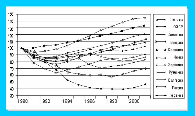 Рис. 2.1 Динамика ВВП стран региона (1990 г. = 100%) [9] В 2000 году впервые с начала процесса экономической и политической трансформации во всей группе бывших стран с централизованно планируемой экономикой Восточной Европы и бывшего Советского Союза был отмечен экономический рост: их совокупный ВВП увеличился на 6%, что существенно больше среднего показателя для мировой экономики в целом. Весьма высокие темпы роста в 2000 году во многом объяснялись неожиданно быстрым оживлением экономической активности в России, ВВП которой увеличился на 7,7%, что является рекордно высоким приростом за более чем 30 лет. После низких показателей в 1999 году был отмечен также существенный рост объема производства в восточной Европе и балтийских государствах, в частности их совокупный ВВП увеличился соответственно на 3,9 и 4,8%. Такие результаты позволяют предположить, что после 15 лет болезненных реформ во многом завершается длительный и глубокий спад в экономике этих стран, связанный с процессом экономической трансформации. Различный опыт в преодолении данного трудного этапа, а также в процессе углубления и расширения реформ сделали этот регион гораздо более разнородным по сравнению с тем, каким он был 15 лет назад. Большинство восточноевропейских государств уже достигли значительного прогресса в формировании нормально функционирующей рыночной экономики, и в них уже на протяжении нескольких лет наблюдается существенный экономический рост, что позволило им занять место среди основных кандидатов на вступление в ЕС. В то же время в ряде других стран трансформационный спад и процесс осуществления основных реформ оказались гораздо более продолжительными и трудными, чем первоначально предполагалось: в некоторых странах СНГ в 2000 году впервые были отмечены положительные темпы роста за десятилетие. 2.2 Оценка современной экономической ситуации в странах Восточной Европы После огромных перемен в странах Восточной Европы и распада бывшего СССР в конце 80-х годов прошлого века, число стран в Центральной и Восточной Европе, включая 3 балтийские страны, достигло 15. С точки зрения уровня экономического развития все страны Восточной Европы делятся на 3 группы: 1) Польша, Чехия, Венгрия и Словакия, которые находятся в Центральной Европе, в период с 1990 года по 2001 год их среднегодовой экономический прирост составил 1,95 процента, по этому показателю эти государства - лидеры региона; 2) страны, расположенные в южной части вышеуказанного района. Среди этих стран лишь экономика Албании и Словении к 2001 г. вновь поднялась до уровня, достигнутого в конце 80-х переломных годов минувшего века, а депрессия в хозяйственной жизни отмечена во всех остальных странах южного региона, которые появились после распада Югославии; 3) 3 балтийские страны - Эстония, Латвия и Литва. Здесь ВВП не достиг уровня 1989 года. В результате проведения радикальных реформ на протяжении последних десяти лет в большинстве стран с переходной экономикой были созданы основные институты рыночный экономики и была осуществлена либерализация внутренних рынков и внешней торговли (хотя и, следует признать, в весьма различной степени). Можно считать, что, за исключением некоторых стран СНГ, страны с переходной экономикой имеют теперь открытые экономические системы, позволяющие им воспользоваться преимуществами расш