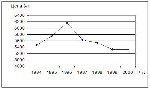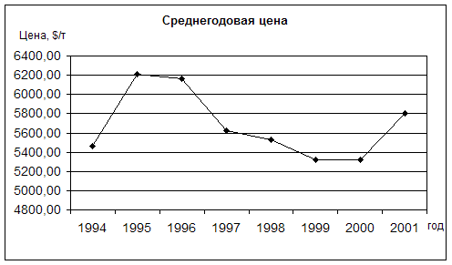 Складские запасы металла на ЛБМ к концу 1994 г. снизились на 20%. В 1995 г. темпы роста цен на олово снизились. С января по декабрь 1995 г. они поднялись всего на 90,2 $/т, хотя и достигли в августе максимальной величины в 6984,6 $/т, а в 1996 г., несмотря кратковременный рост цен в апреле-мае, они даже снизились с 6289,05 $/т в январе до 5833,4 $/т в декабре. Основной причиной медленного роста цен является превышение экспортных квот Китаем и Индонезией. Так при квоте в 30,5 тыс. т Индонезией в 1994 г. фактически было поставлено около 34,5 тыс. т, Китай экспортировал 36,4 тыс. т при квоте 20 тыс. т. Совместно с ростом, имевшем место в Боливии и Перу, это привело к избыточности предложения над спросом, что замедлило темпы роста цен на олово, а начиная со 2-ой половины 1996 г. - к устойчивому их снижению. По данным журнала "Metal Bulletin", мировое потребление олова в 1996 г. возросло примерно на 4 %. Мощности оловянных заводов, как предполагается, возросли на 20 % в результате расширения действующих мощностей в странах Юго-Восточной Азии. По оценкам экспертов "Rudolf Wolf", экспорт из стран бывшего социалистического лагеря в 1996 г. едва ли превысил 43 тыс. т., что, в частности обусловлено повышением внутреннего спроса в Китае, в основном для производства белой жести. Предполагают, что потребители к концу 1996 г. закупили олово не только для удовлетворения текущих нужд, но и для увеличения своих складских запасов. В 1997 г. положение усугубили рост экспорта металла из Китая (30 тыс. т), России (7,6 тыс. т) и Вьетнама (3 тыс. т), а также разразившийся в средине года валютно-финансовый кризис в странах ЮВА. Несмотря на значительный рост потребления олова (на 6 % против 1996 г.), на мировом рынке наблюдался избыток металла. В странах Запада предложение олова превышало спрос примерно на 7 тыс. т. Все эти факторы отрицательно сказались на состоянии мирового рынка олова: среднемесячные цены на металл на ЛБМ снизились с 5856,3 $/т до уровня в 5571,0 $/т в декабре. Падение котировок на ЛБМ в конце 1997 г. привело к увеличению складских запасов с 8 тыс. т в ноябре до 13,2 тыс. т в середине января 1998 г. В 1998 году на мировом рынке наблюдался избыток предложения олова. В странах Запада он составил примерно 7 тыс. т. В 1999 году избыток олова снизился до 5 тыс. т. В 1998 году цены до середины года начали расти - с 5175,1 $/т в январе до 5901,1 $/т в июне, затем во второй года они начали также быстро снижаться, опустившись в декабре до 5257,9 $/т, при этом спрос на олово в США и Западной Европе остался активным. В январе-феврале 1999 года цены на олово сохранялись на уровне 5265,25 $/т, в марте они выросли до 5356,7 $/т. Цены на ЛБМ в июне 1999 года закрепились на уровне 5400 $/т. Динамика среднегодовых цен на металлическое олово (наличный товар) на ЛБМ за 1994-1999 гг. приведена на диаграмме 1(См. Приложение 2). Среднегодовая цена на ЛБМ составляла в 1997 г. - 2,56 $ за а.ф., в 1998 г. - 2,51 $ за а.ф. Среднегодовая цена олова на ЛБМ в 2000 г. прогнозируется фирмой "MBR" в 5460 $/т. Значительное влияние на состояние мирового рынка олова оказывает Китай. Производство олова в КНР в 1998 г. увеличилось на 16,3%. Потребление же металла снизилось на 10%. Экспорт олова увеличился на 48,2% - до 45,5 тыс. т. По мнению фирмы "Metal Bulletin Research" ("MBR"), в начале 1999 г. спрос на олово на мировом рынке примерно соответствовал предложению. Если же Китай в 2000 г. сохранит высокие объемы экспорта, то на мировом рынке будет наблюдаться избыток предложения. Положение с рафин