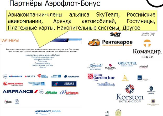 Аэрофлот Бонус — программа поощрения пассажиров российской авиакомпании «Аэрофлот», учрежденная в апреле 1999 года. По состоянию на май 2009 года[1] количество участников программы составляет около 1,5 млн человек, из которых порядка 230 тысяч — иностранные граждане. За каждый совершённый полёт участнику программы в зависимости от класса перевозки и дальности перелёта начисляются премиальные баллы — мили. Размер начисления зависит от тарифа. Мили можно получать также за покупки в определенных магазинах, подписку на газеты и журналы, пользование услугами операторов связи или покупку страховых полисов. Участники программы могут использовать мили для приобретения премиальных авиабилетов, повышения класса билета и получения других услуг от партнёров - гостничных сетей, фирм проката автомобилей и банков, выпускающих платежные карты. Авиакомпании-партнеры программы Авиакомпании-члены альянса SkyTeam: · Korean Air · Delta Air Lines · CSA Czech Airlines · AeroMexico · Kenya Airways · China Southern · Air France-KLM · Alitalia · Air Europa · Northwest Airlines · Tarom · Vietnam Airlines · China Eastern (ожидается в 2011 году) · Shanghai Airlines (ожидается в 2011 году) · Garuda Indonesia (ожидается в 2012 году) · Saudi Arabian Airlines (ожидается в 2012 году) · Middle East Airlines (ожидается в 2012 году) · Aerolíneas Argentinas (ожидается в 2012 году) Российские авиакомпании: · Нордавиа Квалификационные мили Мили, которые набирает участник, путешествуя на регулярных рейсах Аэрофлота или авиакомпаний-партнеров программы в зависимости от расстояния и класса бронирования авиабилета. За полеты на расстояние менее 500 миль на счет участника начисляется 500 миль (кроме Alitalia, China Southern, Kenya Airways, Air Europa, Copa Airlines). Квалификационные мили могут быть использованы для получения премий (премиального авиабилета, повышения класса обслуживания на регулярных рейсах авиакомпании «Аэрофлот», повышения класса обслуживания на рейсах авиакомпаний — партнеров по альянсу Sky Team, а также услуг, предоставляемых Партнерами программы, а также для получения или подтверждения более высокого статуса участника программы). Неквалификационные мили Мили, которые дополнительно набирает участник программы за услуги партнеров, спецпредложения программы, а также элитные мили, начисляемые за полеты участникам Элитного Клуба. Эти мили могут быть использованы только для получения премий и не учитываются при квалификации на уровень. Набор миль Квалификационные мили начисляются только за полеты на регулярных рейсах Аэрофлота и авиакомпаний-партнеров. Неквалификационные мили начисляются за услуги партнеров и спецпредложения программы. Использование миль Участники программы «Аэрофлот Бонус» имеют возможность могут использовать накопленные мили для повышения класса обслуживания, получения премиального авиабилета или оплаты услуги партнеров программы. При этом, премиальный авиабилет бесплатен, но пользователь всё равно должен оплатить ряд сборов и такс. Изначально все неиспользованные мили "замораживались", если в течение двух календарных лет на счете участника не было зарегистрировано ни одного полета по тарифу, участвующему в начислении миль, либо сгорали, если в течение 2-х лет участник не совершал полетов и не пользовался услугами компаний-партнеров (в том числе банков, выпустивших ко-брендинговые карты). В 2010 году компания "Аэрофлот" изменила правила программы - теперь все накопленные мили сгорают, если в 
