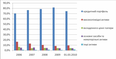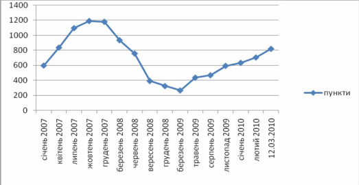 Рисунок 1 - Динаміка індексу ПФТС у 2007-березні 2010 році З початку квітня 2009 року індекс почав поступово зростати і до березня 2010 року не було виявлено жодного падіння пунктів. На початку листопада 2009 року індекс мав значення близьке до 600 пунктів, а вже на кінець лютого 2010 року – вже більше 700 пунктів. Можна зауважити, що спостерігається хоча і не стрімке зростання, але поступово індекс ПФТС наближається до рівня найбільшого свого значення у жовтні 2007 року (трохи менше 1200 пунктів). Про тенденцію зростання свідчить перевищення показника відмітки 810 пунктів на початку березня 2010 року, що безумовно сприяє зростанню вартості акцій підприємств України. Але стверджувати про стрімку зміну динаміки ще зарано, хоча дуже вірогідною є можливість поступового зросту індексу ПФТС. Також вагомим при діагностиці фондового ринку є встановлення показника інвестування банків у цінні папери [2]. Необхідність визначення вкладень у цінні папери зумовлює проведення аналізу структури активів банків у розрізі статей за останні роки (рис. 2) [4].