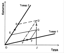 Рис. 5.7. Влияние роста фактора на доходы от производства Допустим, что существуют два товара, производимые с помощью двух факторов производства — труда и капитала. Товар 1 — относительно более трудоемкий, а товар 2 — относительно более капиталоемкий. Пусть вектор 01 на рисунке 5.7 показывает наиболее эффективную технологию (количество труда, приходящееся на единицу капитала) производства товара 1, и поскольку он является трудоемким, то располагается ближе к горизонтальной оси, а вектор 02 показывает наиболее эффективную технологию производства товара 2, и поскольку он является капиталоемким, то располагается ближе к вертикальной оси. Обеспеченность страны в целом трудом и капиталом показана точкой G, которая означает, что в стране имеется OJ труда и JG капитала. При таком количестве факторов производства товар 1 производится в объеме F, а товар 2 — в объеме Е. Предположим, что размеры капитала возросли на GG', при этом размеры другого фактора производства (труда) и цены на товары 1 и 2 остались неизменными. Если построить новую параллелограмму от точки G', показывающей изменившийся уровень обеспеченности капиталом, то очевидно, что после роста обеспеченности капиталом производство трудоемкого товара 1 переместится в точку F', а производство капиталоемкого товара 2 — в точку Е'. Производство капиталоемкого товара 2 в результате увеличения размеров капитала возросло на ЕЕ', а производство трудоемкого товара 1 сократилось на FF'. Тем самым увеличение обеспеченности одним из факторов приводит к росту выпуска того товара, для производства которого он используется относительно более интенсивно, и сокращению выпуска товара, для производства которого он используется относительно менее интенсивно. Нетрудно также заметить, что ЕЕ70Е > GG7JG. Это означает, что увеличение размеров капитала привело к пропорционально большему увеличению производства капиталоемкого товара. «Голландская болезнь» «Голландская болезнь» является частным случаем теоремы Рыбчинского и указывает на то, что активное расширение производства и экспорта в одних отраслях неизбежно ведет к застою или даже падению производства и необходимости импорта в других отраслях. В отдельных случаях такое падение может быть разоряющим, то есть превышать положительные выгоды от расширения производства и роста экспорта, и даже вести к деиндустриализации. В экономической истории известны случаи, когда сдвиг в соотношении производства торгуемых и неторгуемых товаров обусловливался резким изменением в цене природных ресурсов (открытие новых залежей, скачки цен на нефть в середине 70-х гг.). Этот случай модели ТНТ в экономической литературе получил название «голландской болезни» (The Dutch Disease). Голландия обнаружила в 60-е гг. большие запасы природного газа в Северном море. Но чем больше Голландия добывала и продавала газа, тем больше рос реальный обменный курс голландской валюты и тем больше приходил в упадок экспорт других промышленных товаров. Это происходило потому, что факторы производства перетекали из производства традиционно торгуемых промышленных товаров в производство неторгуемых (добыча газа). Потребление неторгуемых товаров росло. Добыча газа требовала все больше капитала, технологии, рабочей силы. Но единственный способ покрыть спрос на неторгуемые товары — увеличить их пр