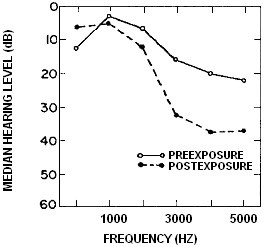 Figure 2.1 Temporary threshold shift for rock band performers. Repeated noise over a long time leads to permanent threshold shift. This is especially true in industrial applications where people are subjected to noises of a certain frequency. There is some disagreement as to the level of noise that should be allowed for an 8-hour working day. Some researchers and health agencies insist that 85 dB(A) should be the limit. Industrial noise level limitations are shown in the Table 2.1. Table 2.1 Maximum Permissible Industrial Noise Levels By OSHA(Occupational Safety and Health Act)