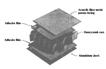 A promising approach to the problem has been the development of a tuned-absorber noise-suppression system that can be incorporated into the inlet and exhaust ducts of turbofan engines. An acoustical system of this type requires that the internal aerodynamic surfaces of the ducts be replaced by sheets of porous materials, which are backed by acoustical cavities. Simply, these systems function as a series of dead-end labyrinths, which are designed to trap sound waves of a specific wavelength. The frequencies for which these absorbers are tuned is a function of the porosity of flow resistance of the porous facing sheets and of the depth or volume of the acoustical cavities. The cavity is divided into compartments by means of an open cellular structure, such as honeycomb cells, to provide an essentially locally reacting impedance (Fig. 7.3). This is done to provide an acoustic impedance almost independent of the angle of incidence of the sound waves impinging on the lining.