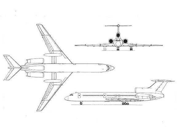 Figure 5.2 Noise limits imposed by ICAO Annex 16 for certification of aircraft. On take-off, however, aircraft with fewer engines climb out faster, so they are higher above the measuring point. Here the “reasonable and economically practicable” principle comes into dictate that three-engine and two-engine aircraft have lower noise levels at the take-off noise station than four-engine aircraft. There is some flexibility in the rule, in that the noise levels can be exceeded by up to 2 EPNdB at any station provided the sum of the exceedances is not over 3 ENPdB and that the exceedances are completely offset by reductions at other measuring stations. 6 Noise Level Calculations6.1 Tupolev 154M DescriptionFor most airlines in the CIS, the Tupolev Tu-154 is nowadays the workhorse on domestic and international routes.
