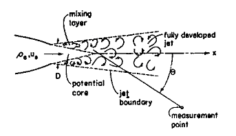 Figure 3.1 A subsonic jet mixing with ambient air, showing the mixing layer followed by the fully developed jet. For the subsonic jets the turbulence in the jet can be viewed as a distribution of quadrupoles. 3.2 Turbomachinery NoiseTurbomachinery generates noise by producing time-dependent pressure fluctuations, which can be thought of in first approximation as dipoles since they result from fluctuations in force on the blades or from passage of lifting blades past the observer. It would appear at first that compressors or fans should not radiate sound due to blade motion unless the blade tip speed is supersonic, but even low-speed turbomachines do in fact produce a great deal of noise at the blade passing frequencies. 4 Noise Measurement and RulesHuman response sets the limits on aircraft engine noise. Although the logarithmic relationship represented by the scale of decibels is a first approximation to human perception of noise levels, it is not nearly quantitative enough for either systems optimization or regulation. Much effort has gone into the development of quantitative indices of noise. 4.1 Noise Effectiveness Forecast (NEF)It is not the noise output of an aircraft per se that raises objections from the neighborhood of a major airport, but the total noise impact of the airport’s operations, which depends on take-off patterns, frequencies of operation at different times of the day, population densities, and a host of less obvious things. There have been proposals to limit the total noise impact of airports, and in effect legal actions have done so for the most heavily used ones. One widely accepted measure of noise impact is the Noise Effectiveness Forecast (NEF), which is arrived at as follows for any location near an airport: 1. For each event, compute the Effective Perceived Noise Level (EPNL) by the methods of ICAO Annex 16, as described below. 2. For events occurring between 10 PM and 7 AM, add 10 to the EPNdB. 3. Then NEF = 4.2 Effective Perceived Noise Level (EPNL)The perceived noisiness of an aircraft flyover depends on the frequency content, relative to the ear’s response, and on the duration. The perceived noisiness is measured in NOYs (unit of perceived noisiness) and is plotted as a function of sound pressure level and frequency for random noise in Fig. 4.1.
