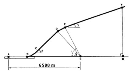 6.2.1 Take-off Noise CalculationThe aircraft begins the take-off roll at point A (Fig. 6.2), lifts off at point B, and initiates the first constant climb at point C at an angle β. The noise abatement thrust cutback is started at point D and completed at point E where the second constant climb is defined by the angle γ (usually expressed in terms of the gradient in percent). The end of the noise certification take-off flight path is represented by aircraft position F whose vertical projection on the flight track (extended centerline of the runway) is point M. The position of the aircraft must be recorded for the entire interval during which the measured aircraft noise level is within 10 dB of PNLTM. Position K is the take-off noise measuring station whose distance AK is specified as 6500 meters.