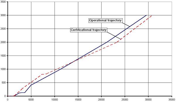 Figure 6.3 Comparison between operational and certification trajectories The climb path for Tupolev 154M was calculated using the following equation