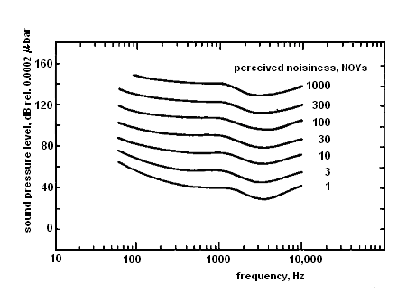 Figure 4.1 Perceived noisiness as a function of frequency and sound pressure levelPure tones (frequencies with pressure levels much higher than that of the neighboring random noise in the sound spectrum) are judged to be more annoying than an equal sound pressure in random noise, so a “tone correction” is added to their perceived noise level. A “duration correction” represents the idea that the total noise impact depends on the integral of sound intensity over time for a given event. The 24 one-third octave bands of sound pressure level (SPL) are converted to perceived noisiness by means of a noy table.