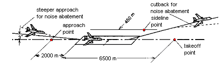 where Dt = 0.5 sec, T = 10 sec, and d is the time over which PNLT exceeds PNLTM – 10 dB. This amounts to integrating the sound pressure level over the time during which it exceeds its peak value minus 10 dB, then converting the result to decibels. All turbofan-powered transport aircraft must comply at certification with EPNL limits for measuring points which are spoken about in the next chapter. 5 Noise CertificationThe increasing volume of air traffic resulted in unacceptable noise exposures near major urban airfields in the late 1960s, leading to a great public pressure for noise control. This pressure, and advancing technology, led to ICAO Annex 16, AP-36, Joint Aviation Regulation Part 36 (JAR-36) and Federal Aviation Rule Part 36 (FAR-36), which set maximum take-off, landing and “sideline” noise levels for certification of new turbofan-powered aircraft. It is through the need to satisfy this rule that the noise issue influences the design and operation of aircraft engines. A little more general background of the noise problem may be helpful in establishing the context of engine noise control. The FAA issued FAR-36 (which establishes the limits on take-off, approach, and sideline noise for individual aircraft), followed by ICAO issuing its Annex 16 Part 2, and JAA issuing JAR-36. These rules have since been revised several times, reflecting both improvements in technology and continuing pressure to reduce noise. As of this writing, the rules are enunciated as three progressive stages of noise certification. The noise limits are stated in terms of measurements at three measuring stations, as shown in Fig. 5.1: under the approach path 2000 m before touchdown, under the take-off path 6500 m from the start of the take-off roll, and at the point of maximum noise along the sides of the runway at a distance of 450 m.