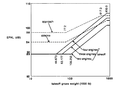 Figure 5.1 Schematic of airport runway showing approach, take-off, and sideline noise measurement stations. The noise of any given aircraft at the approach and take-off stations depends both on the engines and on the aircraft’s performance, operational procedures, and loading, since the power settings and the altitude of the aircraft may vary. The sideline station is more representative of the intrinsic take-off noise characteristics of the engine, since the engine is at full throttle and the station is nearly at a fixed distance from the aircraft. The actual distance depends on the altitude the aircraft has attained when it produced maximum noise along the designated measuring line. Since FAR-36 and international rules set by the International Civil Aviation Organization (ICAO annex 16, Part 2) which are generally consistent with it have been in force, airport noise has been a major design criterion for civil aircraft. Stricter noise pollution standards for commercial aircraft, established by the International Civil Aviation Organization, came into effect worldwide on 1 April. Most industrialized countries, including all EU states, enforced the new rules and the vast majority of airliners flying in those states already meet the more stringent requirements. But some Eastern European countries are facing a problem, especially Russia. Eighty percent of its civilian aircraft fall short of the standards, meaning it will not be able to apply the new rules for domestic flights. Even more worrisome for Moscow is the fact that Russia could find many of its planes banned from foreign skies. Enforcement of the new rules could force Russia to cancel 11,000 flights in 2002, representing some 12 percent of the country's passenger traffic. The new rules have been applied only to subsonic transports, because no new supersonic commercial aircraft have been developed since its promulgation. 5.1 Noise LimitsAs mentioned above, all turbofan-powered transport aircraft must comply at certification with EPNL limits for the three measuring stations as shown in Fig. 5.1. The limits depend on the gross weight of the aircraft at take-off and number of engines, as shown in Fig. 5.2. The rule is the same for all engine numbers on approach and on the sideline because the distance from the aircraft to the measuring point is fixed on approach by the angle of the approach path (normally 3 deg) and on the sideline by the distance of the measuring station from the runway centerline.