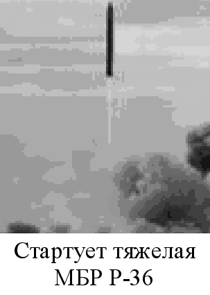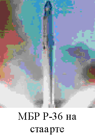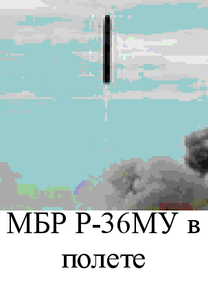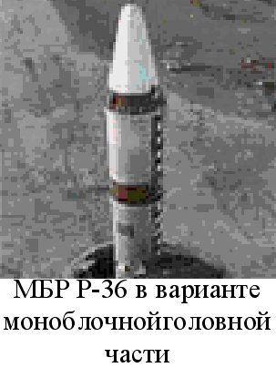 Д Двигательная установка второй ступени состояла из однокамерного маршевого и четырехкамерного рулевого жидкостных ракетных двигателей, выполненных по закрытой и открытой конструктивных схемах соответственно. Все жидкостные ракетные двигатели работали на самовоспламеняющихся при взаимном контакте компонентах топлива. В ракете практически реализован целый ряд оригинальных технических решений и идей, например, так называемый химический (путем впрыска окислителя в бак горючего и горючего - в бак окислителя) наддув баков, торможение отделяемой ступени за счет истечения газов наддува и др. На ракету была установлена инерциальная система управления, работу которой обеспечивал бортовой цифровой вычислительный комплекс. Его применение позволило добиться высокой точности стрельбы. МБР этого типа несли особенно мощное боевое оснащение. Существовало два варианта головных частей: моноблочная термоядерная с мощностью до 25 Мт и РГЧ с восемью боевыми блоками индивидуального наведения мощностью по 500 кт каждый. Кроме того имелся комплекс преодоления систем ПРО. Ракета Р-36М, помещенная в транспортно-пусковой контейнер, устанавливалась в шахтную пусковую установку повышенной защищенности. После проведения заправочных операций она могла находиться в заправленном состоянии длительное время. Подготовка к старту и пуск осуществлялись автоматически после получения системой управления пусковой команды. Наиболее важные параметры ракеты находились под постоянным контролем, что повышало надежность выполнения боевой задачи. Ракета имеет схему старта. На вооружении эта ракета простояла до середины 80-х годов, пока не была заменена ракетой Р-36МУ, которая была ее модификацией. Своим появлением она была обязана разработке американцами нейтронных боеприпасов, новым достижениям в области электроники и машиностроения, возрастанием требований к боевым и эксплуатационным характеристикам ракетных комплексов стратегического назначения. МБР Р-36МУ отличалась от своей предшественницы более совершенной системой управления и доработанным агрегатно-приборным блоком. Число боевых блоков возросло до 10. При этом они размещались в два яруса на специальной раме и прикрывались обтекателем. Значительно улучшились эксплуатационные характеристики всего БРК. Возросла защищенность пусковых установок и пунктов управления. Летно-конструкторские испытания этой ракеты начались 31 октября 1977 года на полигоне Байконур, а 18 сентября 1979 года три ракетных полка в г. Жангизтобе, г. Домбаровском и г. Ужуре приступили к несению боевого дежурства на новой ракетной технике. Всего было развернуто 308 пусковых установок с ракетами Р-36М и Р-36МУ. В 1983 году конструкторскому коллективу КБ было поставлено задание доработать ракету таким образом, чтобы она могла преодолевать перспективную американскую систему противоракетной обороны. Также ставилась задача повысить защищенность ракеты и всего комплекса к действию поражающих факторов ядерного взрыва. В период с марта 1986 года по июль 1988 года проводились летно-конструкторские испытания модернизированной ракеты. 11 августа 1988 года она была принята на вооружение РВСН. Конструкторам удалось внедрить ряд новых конструктивных решений, что повысило характеристики МБР и упростило эксплуатацию. Ракеты этого типа являют