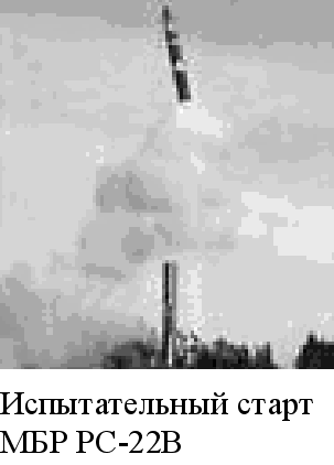 В 27 февраля 1985 года на полигоне Плесецк начались летно-конструкторские испытания МБР для железнодорожного комплекса, получившей обозначение РС-22В. Несмотря на некоторые трудности на первом этапе, конструкторскому коллективу удалась довести свое детище до требуемых кондиций, что позволило завершить испытания 22 декабря 1987 года. Осенью этого же года на опытную эксплуатацию был поставлен первый ракетный полк в г. Костроме. Позднее на трех ракетных базах было развернуто еще 30 МБР этого типа. Твердотопливная ракета РС-22В выполнена трехступенчатой по схеме с учетом новейших технологий (коконная конструкция корпусов) и по конструктивно-компоновочной схеме подобна американской . Первая ступень включает хвостовой и соединительные отсеки цилиндрической формы и маршевый РДТТ, снабженный одним неподвижным соплом. Вторая ступень состоит из маршевого РДТТ и соединительного отсека. Сопло двигателя снабжено выдвижным насадком, что позволяет увеличить удельный импульс при работе двигателя на больших высотах при сохранении исходных габаритов ступени. Третья ступень включает в себя маршевый РДТТ, по своей конструкции аналогичному двигателю на второй ступени, и переходной отсек. Ракета несет разделяющуюся головную часть типа с 10 боеголовками мощностью по 500 кт. Ступень разведения выполнена по стандартной схеме и включает двигательную установку и систему управления. Головная часть прикрывается обтекателям изменяемой геометрии. Инерциальная система управления обеспечивает проведение проверок и непрерывный контроль технического состояния ракеты, предстартовую подготовку и старт ракеты, управление полетом и разведение боевых блоков с высокой точностью. КВО точек падения составляет не более 200 м при стрельбе н дальность порядка 10000 км. Пуск можно проводить с любой пригодной для этого точки маршрута боевого патрулирования. В состав железнодорожного комплекса входят три пусковые установки с ракетами, командный пункт и вагоны, в которых размещены технические и технологические системы, обеспечивающие функционирование комплекса на всех этапах боевого дежурства, а также жизнедеятельность личного состава. Вагон-пусковая установка оборудован раздвижной крышей. Перед стартом контейнер с ракетой переводится в вертикальное положение. Из ТПК ракета выбрасывается за счет давления, образующегося при срабатывании ПАД. До 1991 года БЖРК регулярно курсировали по железнодорожным магистралям Советского Союза, пока осенью этого года Горбачев и Р. Рейган не договорились поставить их на прикол в пунктах постоянной дислокации. Тогда же в ответ на инициативу США (прекращение разработки МБР железнодорожного базирования, проходившей в то время полигонные испытания) Горбачев поспешил объявить об отказе от дальнейшего развертывания и модернизации МБР РС-22В. Этим он ограничил период пребывания ракет этого типа на боевом дежурстве гарантийным сроком эксплуатации. Вскоре предприятия производящие эту ракету оказались за пределами России, чем окончательно подписали приговор РС-22 как железнодорожного, так и шахтного базирования. Последняя имеет обозначение РС-22А. РС-22А создавалась для замены жидкостной УР-100НУ. Планировалось, что базироваться эта ракета будет в тех же ШПУ. От ракеты для БЖРК она отличается конструкцией первой ступени и головного