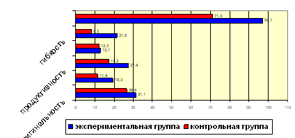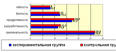 трех частей: Мы решили провести именно комплексную диагностику творческих способностей для того, чтобы выявить, как работа по развитию гибкости мышления влияет на формирование других творческих качеств учащихся, а также чтобы получить более полную картину личности и изучить механизмы мышления потенциального «творца». Тест дивергентного мышления направлен на диагностику комбинации вербальных левополушарных показателей и правополушарных визуально-перцептивных показателей. Данные оцениваются с помощью четырех факторов дивергентного мышления: беглость, гибкость, оригинальность и разработанность. По мнению авторов теста, полный тест отражает когнитивно-аффективные процессы синхронной деятельности правого и левого полушарий мозга. Тест творческих характеристик личности – это опросник, состоящий из 50-ти пунктов, помогающих выяснить, насколько любознательными, наделенными воображением, умеющими разбираться в сложных идеях и способными на риск считают себя учащиеся. Эти факторы, по мысли разработчиков, являются индивидуально-личностными по природе и соответствуют чередованию левополушарного вербального анализа с правополушарными процессами. Шкала Вильямса представляет собой опросник, с помощью которого посредством наблюдения можно оценить восемь факторов креативности, определяемых в двух предыдущих тестах. В опроснике приводятся по шесть характеристик для каждого из восьми факторов, по которым родителям и учителям предлагается оценить учащегося. Имеется также четыре вопроса открытого типа для самостоятельной характеристики ученика родителями и учителями. Эта шкала наглядно демонстрирует, на каком уровне, по мнению родителей и учителей, находятся творческие характеристики наблюдаемого ребенка. Два первых теста, предназначенные для детей, проводились совместно с классным руководителем на классном часу. Шкалу Вильямса для родителей и учителей педагоги заполняли в школе (в исследовании приняли участие 10 учителей-предметников и классные руководители контрольного и экспериментального классов), а материалы для родителей были переданы на дом родителям в конверте с просьбой принять участие в изучении творческих способностей ребенка. Для каждого ребенка были подсчитаны результаты и по данным учителя, и по данным родителей. Полученные от учителей и родителей результаты, были сопоставлены с результатами тестов творческого мышления и личностных творческих характеристик. В формирующем эксперименте приняли участие 32 учащихся десятых классов МОУ СОШ №4 г. Елабуга. Сравнительный анализ проводился между учащимися контрольного и экспериментального классов до и после формирующего эксперимента. Данные психодиагностического исследования показывают, что до проведения формирующего эксперимента цифровые показатели контрольной и экспериментальной групп учащихся различались в незначительной степени: