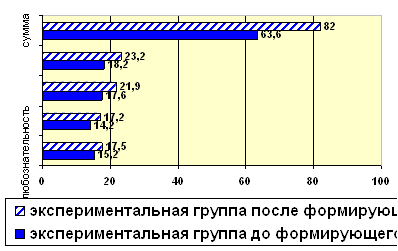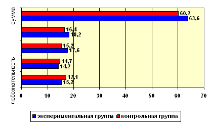 Рис. 3. Сравнительный анализ результатов психодиагностического исследования методом самоотчета среди учащихся контрольного и экспериментального классов до формирующего эксперимента. Показатели любознательность 17,1 – 15,2 = 1,9 воображение 14,7 – 14,2 = 0,5 были незначительно выше в контрольной группе, разница составляла не более 0,3 балла. Показатели: сложность 17,6 – 15,2 = 2,4 рискованность 18,2 – 16,4 = 1,8 суммарный балл 63,6 – 60,2 = 3,4 были выше в экспериментальной группе, но имевшаяся разница не выходила за границы нормативных данных для опросника, приведенных авторами-разработчиками. После проведения формирующего педагогического эксперимента мы могли констатировать значимую положительную динамику развития творческих способностей в экспериментальной группе.