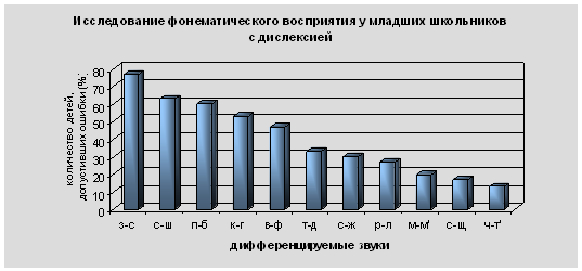 Диаграмма 1 У детей, не страдающих нарушением чтения, были выявлены единичные ошибки при дифференциации аккустически сходных звуков, которые носили несистемный характер. Для оценки различий сформированности уровня фонематического восприятия у школьников с дислексией и нормально развивающихся школьников, нами был проведен статистический анализ данных по критерию Манна-Уитни. Критерий рассчитывался по следующей формуле: